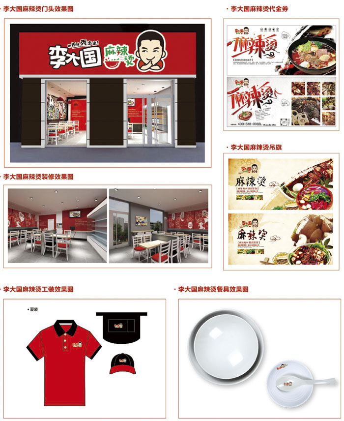 策劃團隊,在幾十個備選方案中選擇出最佳品牌名稱——李大國麻辣燙,根據品牌名稱反復修改LOGO設計多達12次,在新媒體、自媒體、網絡平臺進行品牌宣傳策劃,提高知名度。